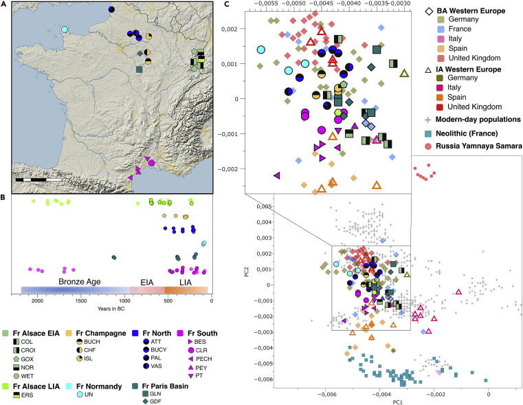 After the Roman conquest, Gaul adopted Latin, which evolved into French and other Romance languages. Yet genome-wide studies reveal deep continuity between Iron Age Gauls and modern French. In the Fisher et al., 2022 study (Cell Reports), the PCA shows Iron Age and modern French individuals clustering almost identically, proving that Romanization was cultural, not genetic.